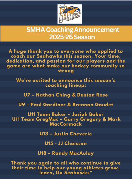 Development ice times wrap up this week and SMHA regular season begins on the 19th (we are finalizing ice times and will share soonest).